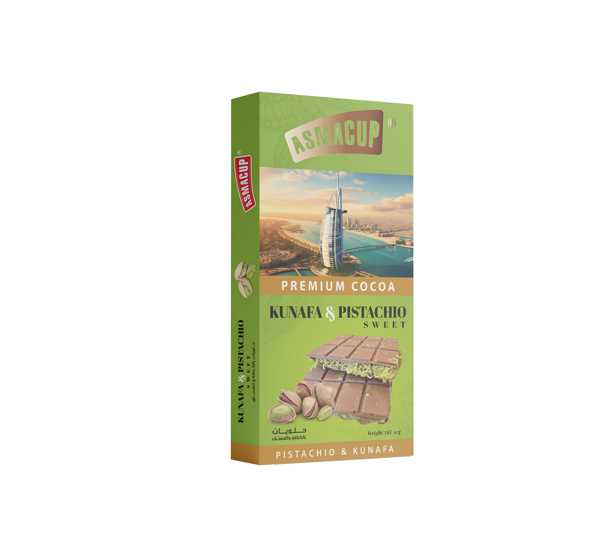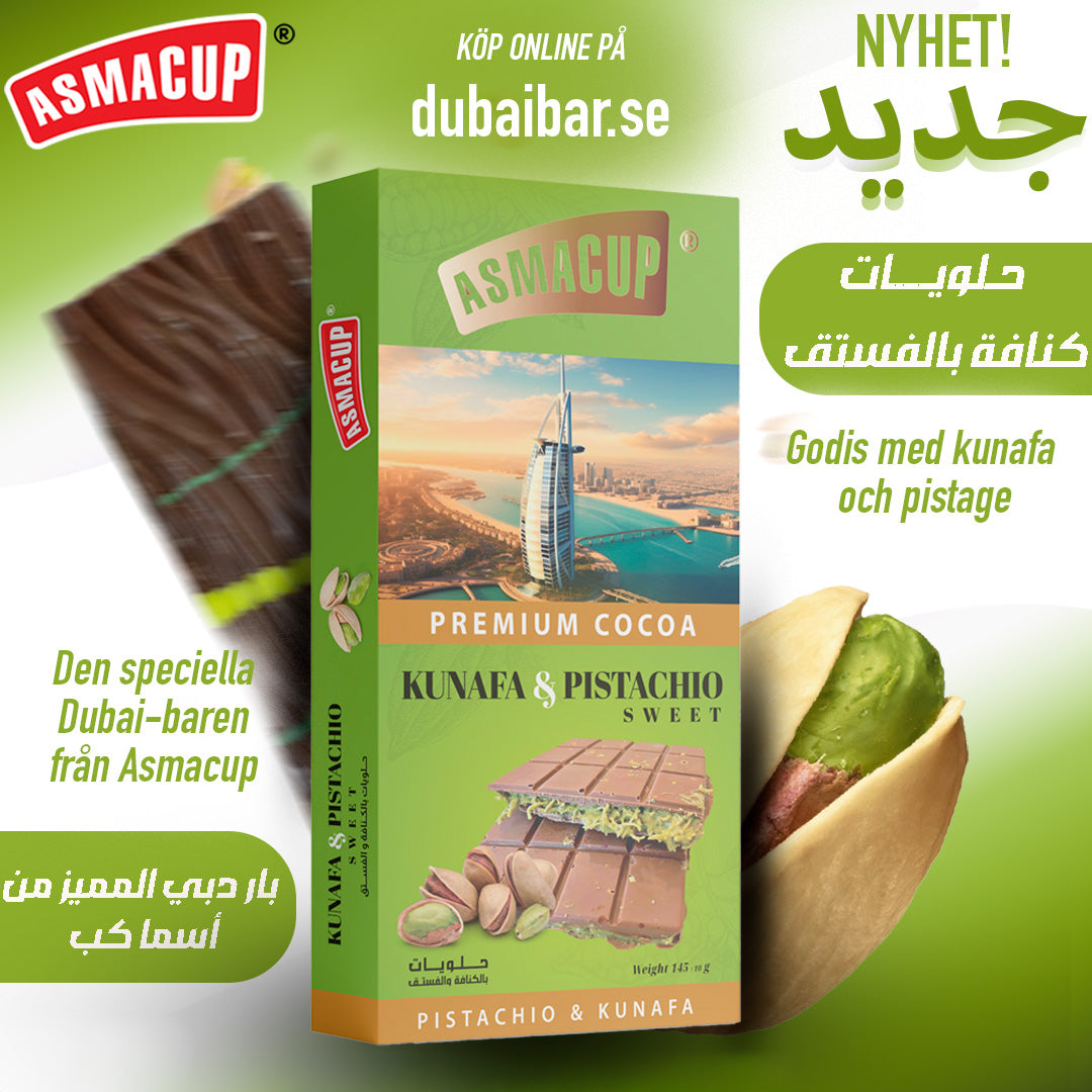 🍫 Dubai Bar – Kunafa med pistage 🍃Smaken som fångar dig från första tuggan!Krämig kakao fylld med krispig kunafa och lyxig pistage … en kombination utan dess like! 🤯Unna dig själv något kungligt – den här smaken är inget skämt!